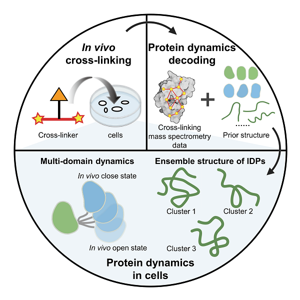 近期,中国科研实验室evo真人视讯与大连化物所合作,提出一种利用原位化学交联-质谱技术(in vivo XL-MS)结合结构计算与模拟研究细胞中蛋白质动态结构的策略。该策略从蛋白质结构的先验信息(包括核磁结构、晶体结构和AlphaFold2预测的结构等)出发,将in vivo XL-MS取得的距离约束与多种结构计算方法结合,用于多种细胞内蛋白质结构重构,重点研究了多结构域蛋白质和天然无序蛋白的动态结构,有助于加深对细胞微环境中蛋白质发挥功能的分子机制的理解。该研究成果发表于《德国应用化学》(Angew. Chem. Int. Ed.