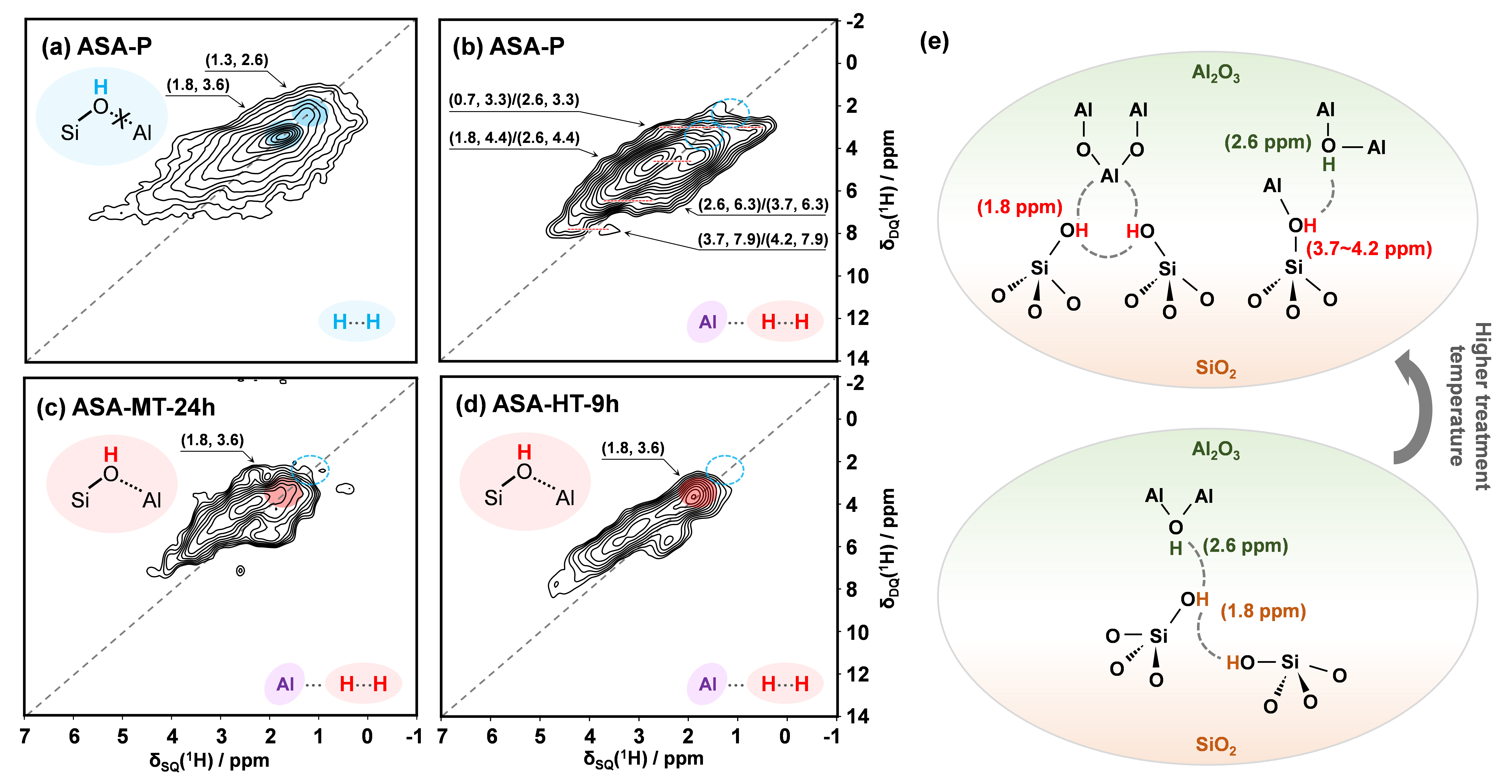 图1. (a) 脱水ASA-P的二维1H-1H DQ/SQ NMR谱图;(b-d) 脱水ASA-P、ASA-MT-24h和ASA-HT-9h的二维1H-1H f-DQ/SQ NMR谱图;(e) 提出的ASA表面物种结构模型