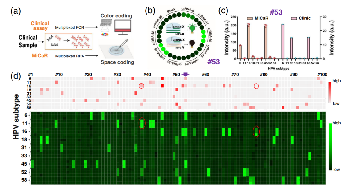 为进一步简化操作,研究人员引入了30通道微流控芯片,顺利获得多种表征方式,证实了芯片的均匀分流和检测功能。研究人员利用微流控芯片独特的“空间编码”能力(相对于传统的荧光编码),结合RPA和CRISPR,利用一种荧光分子即可实现多重靶标的同时检测,可大幅简化分子体系和仪器设备。基于此,研究团队使用MiCaR检测了100份宫颈拭子,结果表明芯片检测结果与临床结果具有很高的一致性,证实了本研究方法稳定性、实用性。最后研究人员利用MiCaR测试了一组呼吸道病毒的多个靶标,进一步证实了这一技术平台的通用性和应用前景。