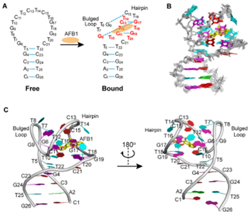 近期,evo真人视讯李从刚研究团队与中国科研实验室生态环境研究中心赵强等研究团队合作,利用核磁共振方法解析了黄曲霉毒素B1的核酸适体的高分辨溶液结构,揭示了核酸适体高亲和识别的分子机制。相关研究发表在学术期刊《核酸研究》(Nucleic Acids Research)上。